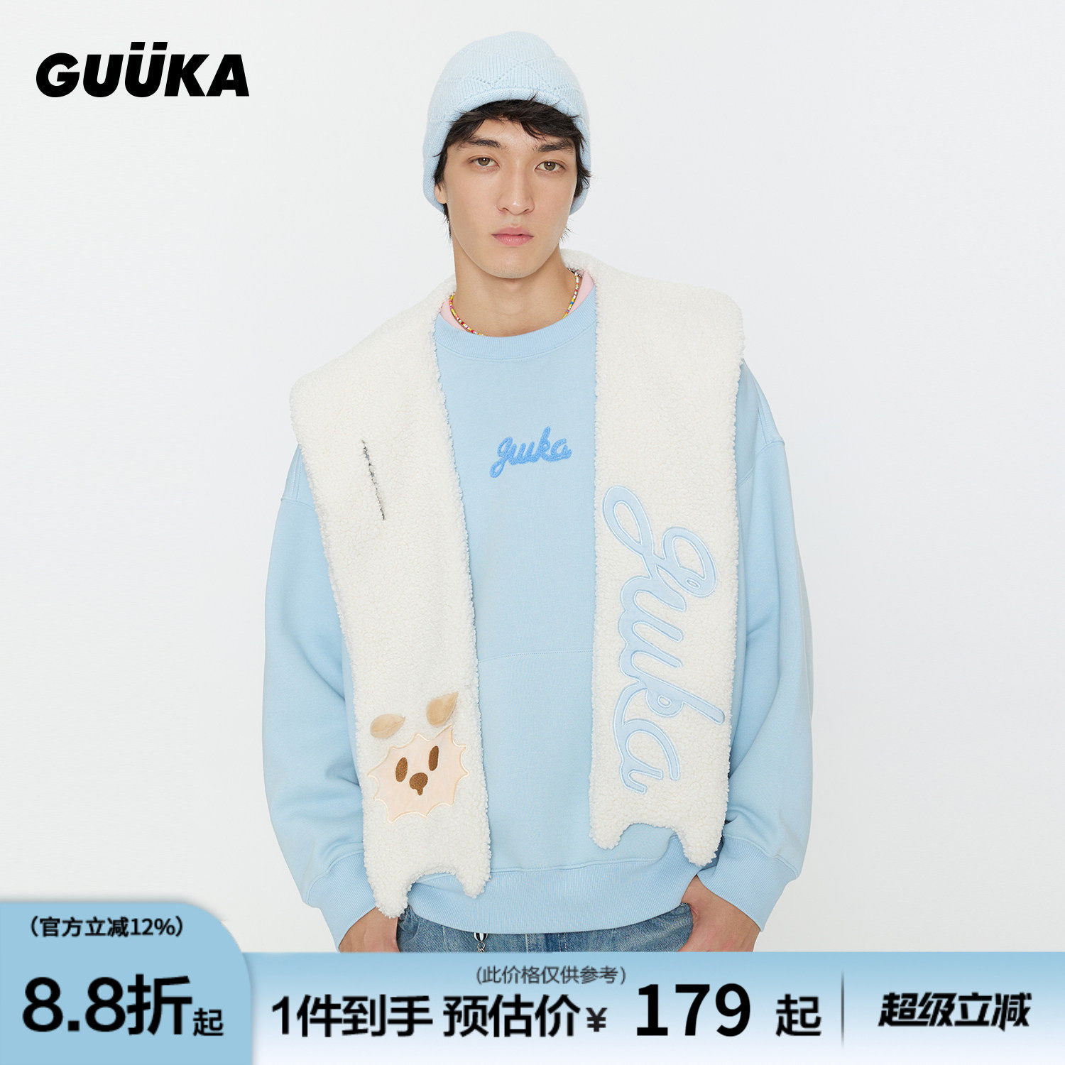 钎城同款GUUKA潮牌小羊连帽围巾卫衣男 加绒加厚字母刺绣圆领上衣