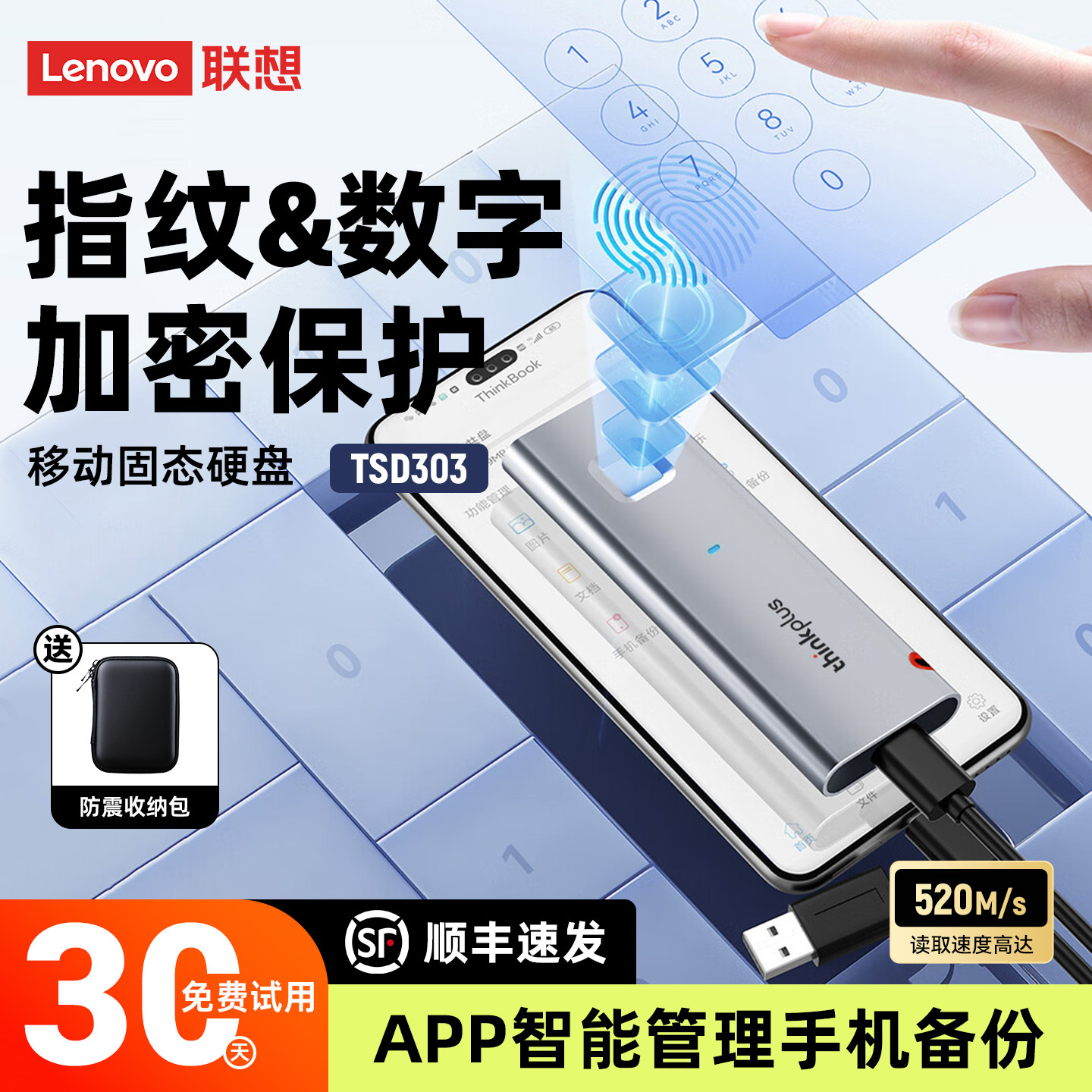 联想指纹加密移动固态硬盘1T苹果华为小米手机外接硬盘电脑两用2t