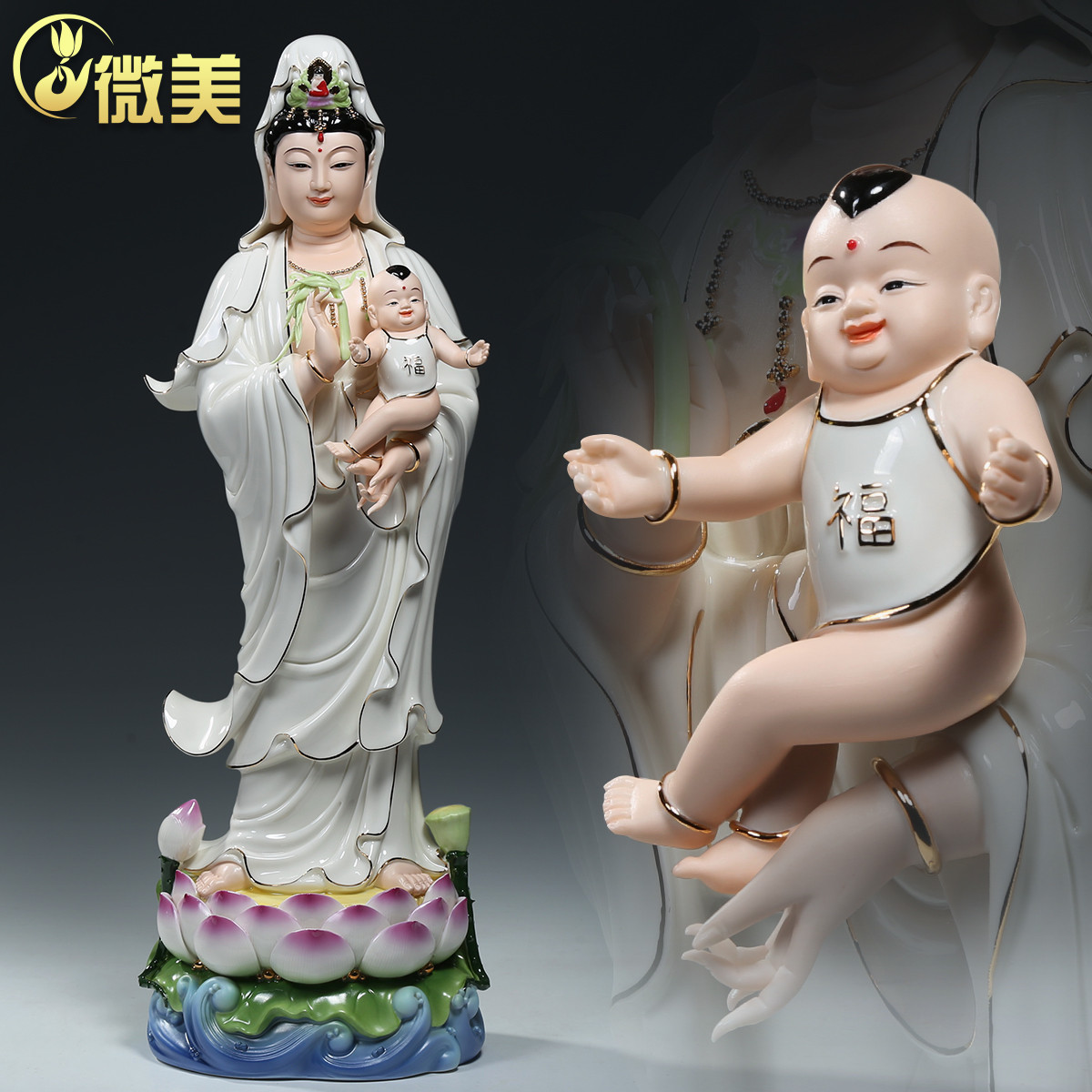 微美 16至26寸立莲双子送子观音佛像摆件现代高端手绘陶瓷家居