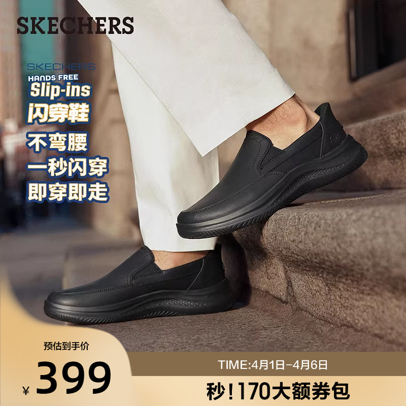 斯凯奇闪穿鞋slipins2026春新款男鞋一脚蹬通勤商务休闲黑色皮鞋