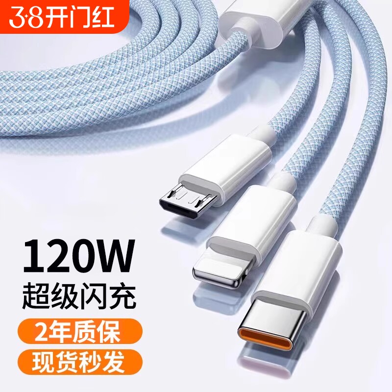 【官方正品】三合一数据线120W充电器适用苹果安卓充电头编织一拖三多功能多头车载充电快充套装USB插口通用