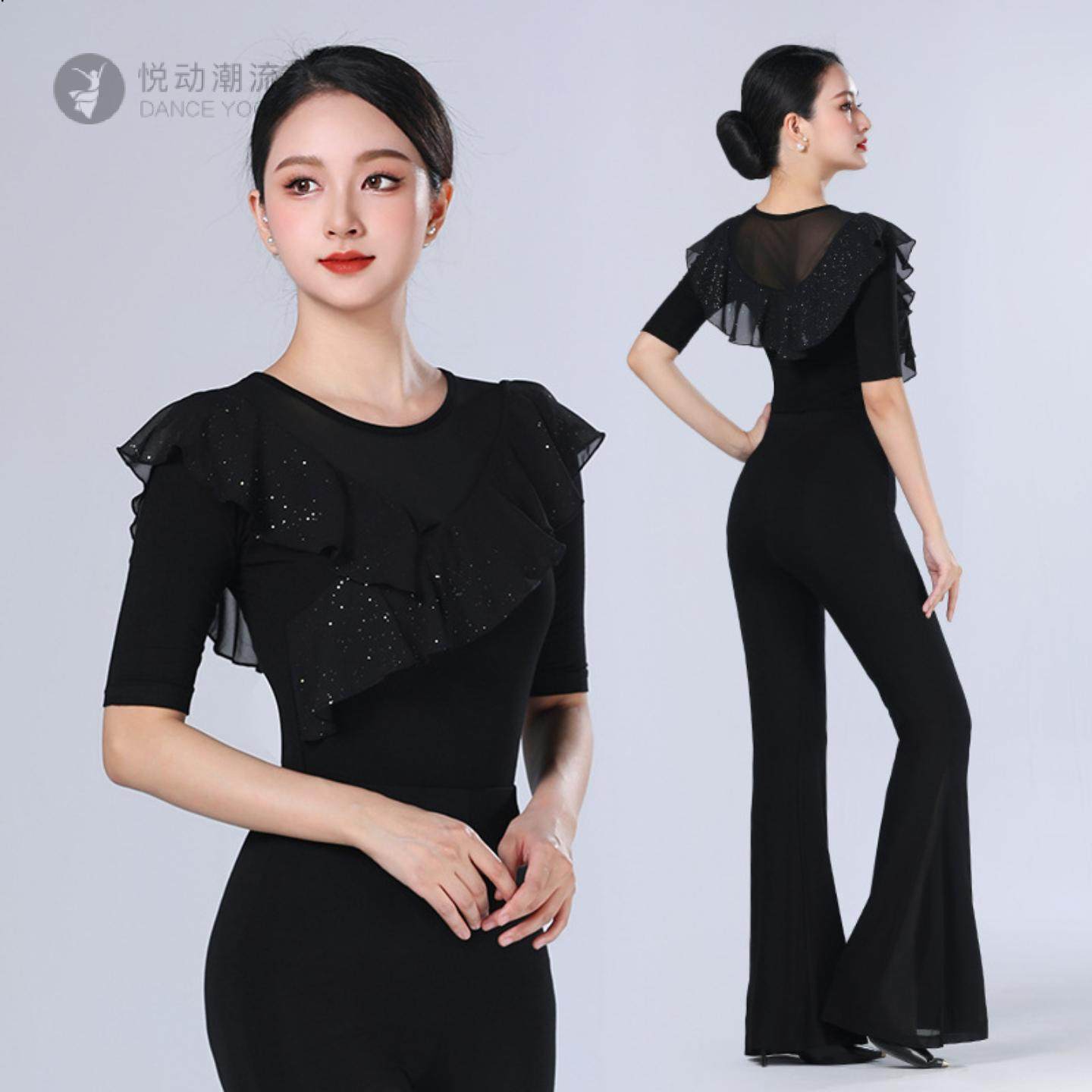 新款亮片走秀训练拉丁服装女夏季舞蹈导师形体服喇叭裤练功服套装
