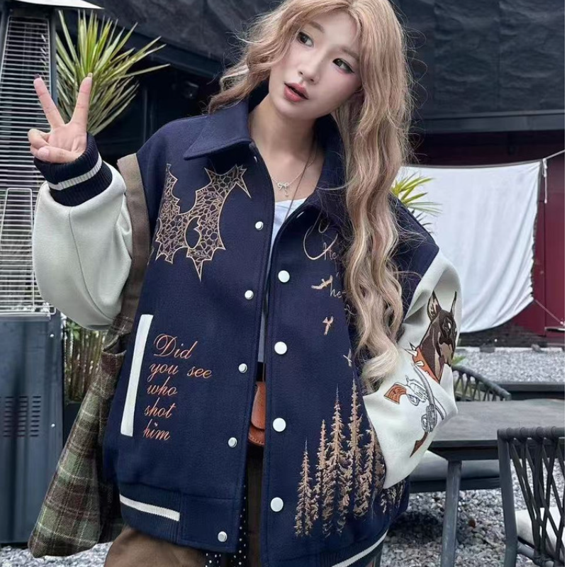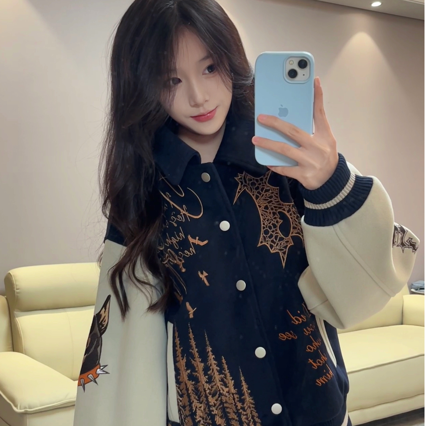 美式复古重磅刺绣夹克外套长袖女秋冬宽松潮牌oversize棒球服上衣