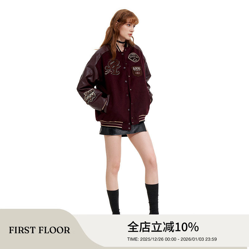 FIRSTFLOOR复古呢料皮拼接刺绣棒球服女街头宽松夹棉服长袖外套冬