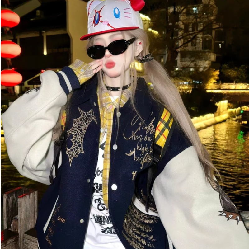 美式高街重工刺绣毛呢长袖夹克棒球服女春秋新款宽松拼色外套上衣