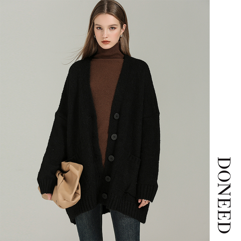 DONEED秋冬款韩式慵懒感毛衣落肩袖毛织开衫中长款保暖外套女