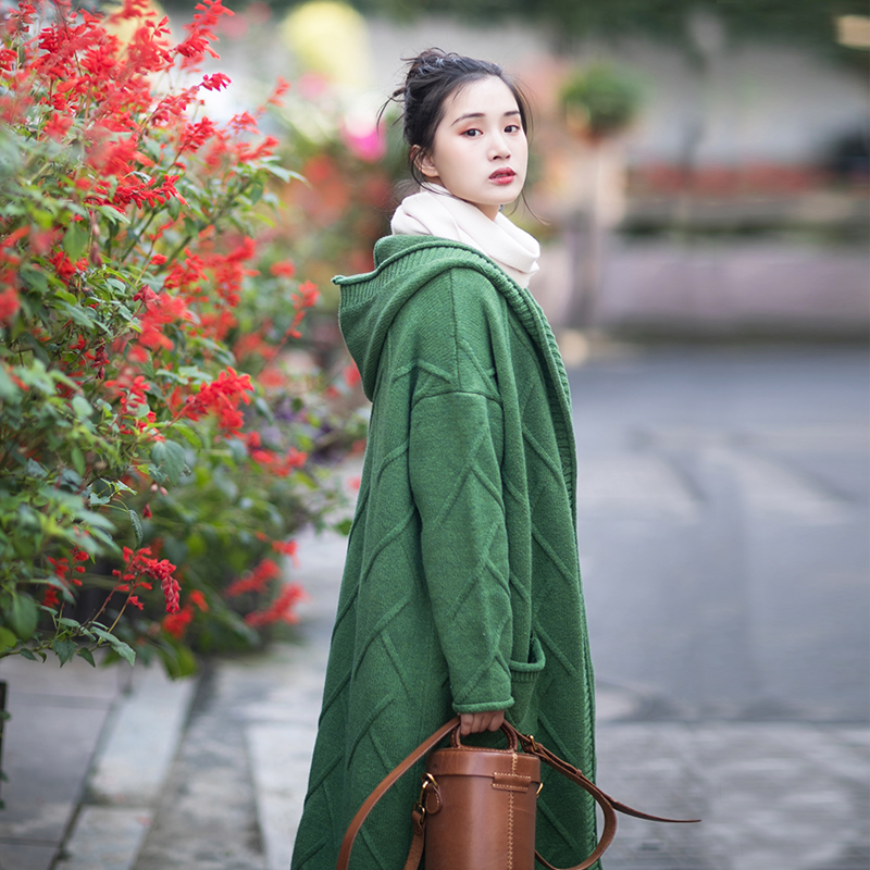 【7折】秋冬款加厚针织衫宽松中长款连帽长款毛衣外套女开衫保暖