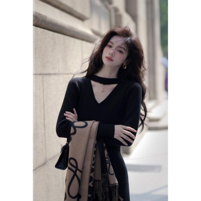 秋冬款纯欲松弛感慵懒风大V领收腰显瘦中长款针织衫软糯舒适毛衣