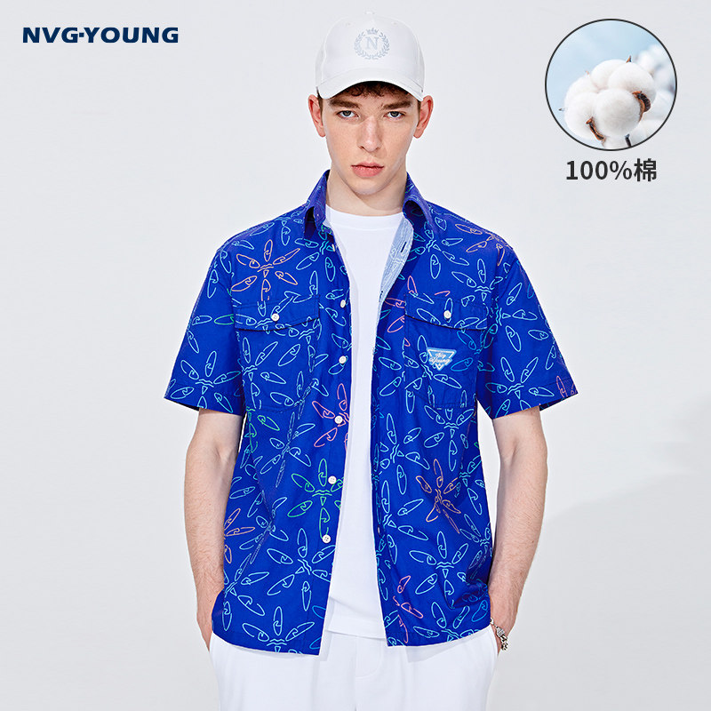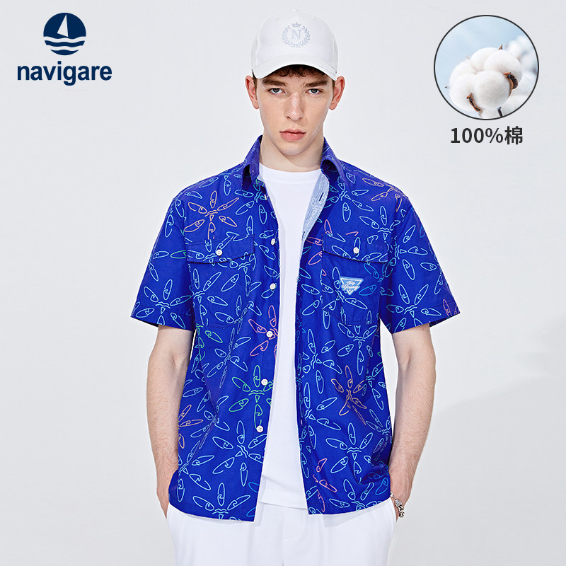 Navigare意大利小帆船纯棉短袖潮牌衬衫男克莱因蓝工装衬衣薄外套
