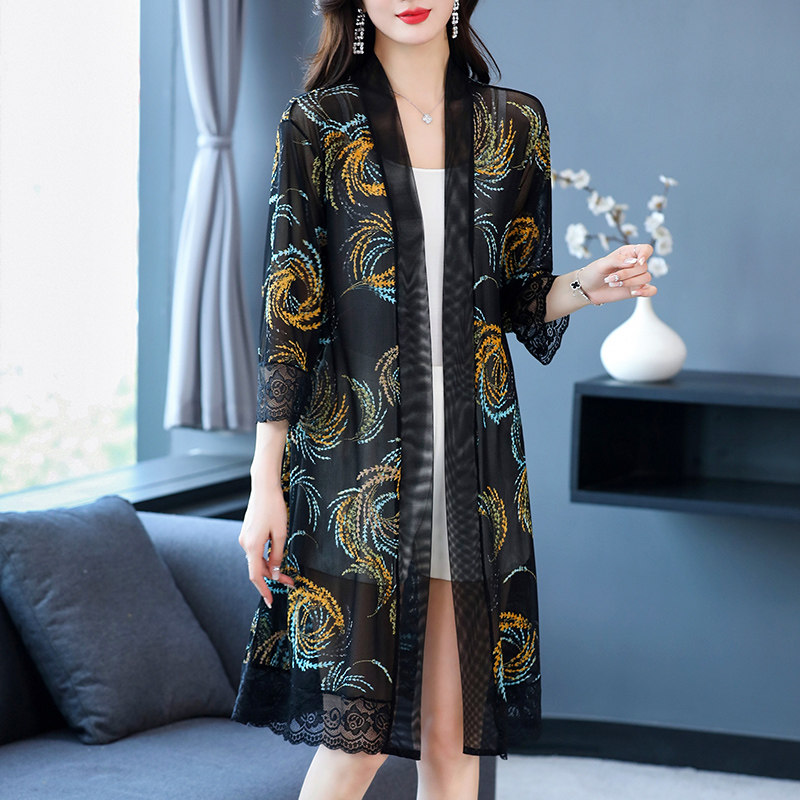 春夏季薄外搭大码网纱防晒衣女开衫中长款披肩蕾丝上衣空调衫外套