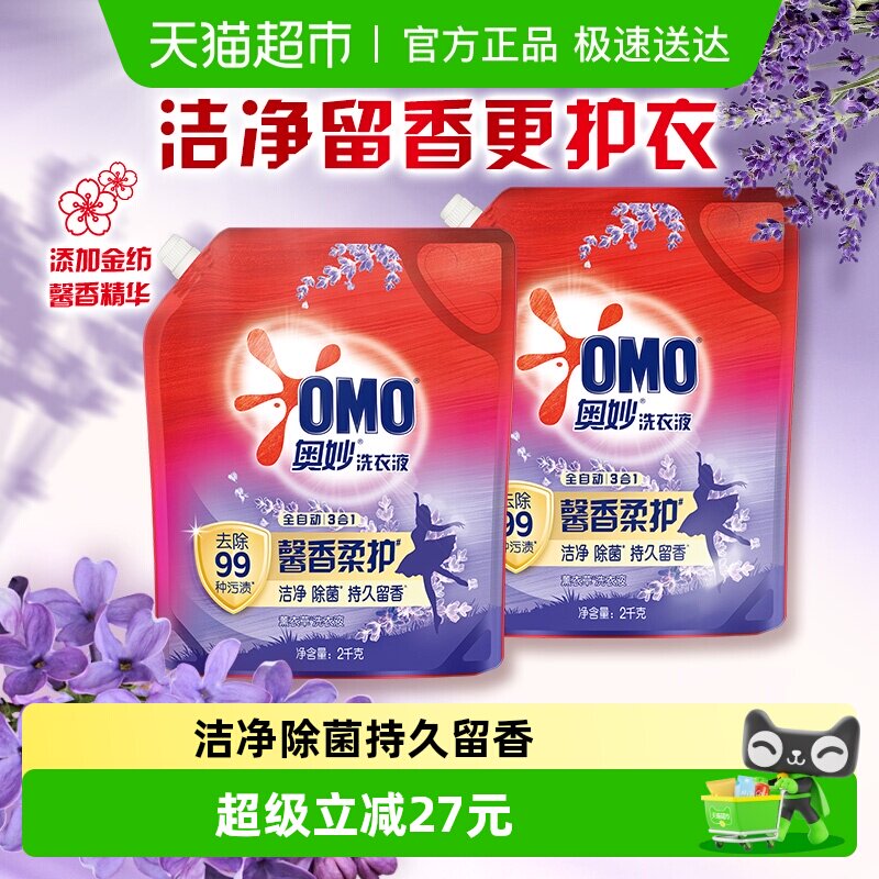 奥妙全自动薰衣草洗衣液袋装酵素2KG*2袋长效抑菌祛渍护形不皱褶