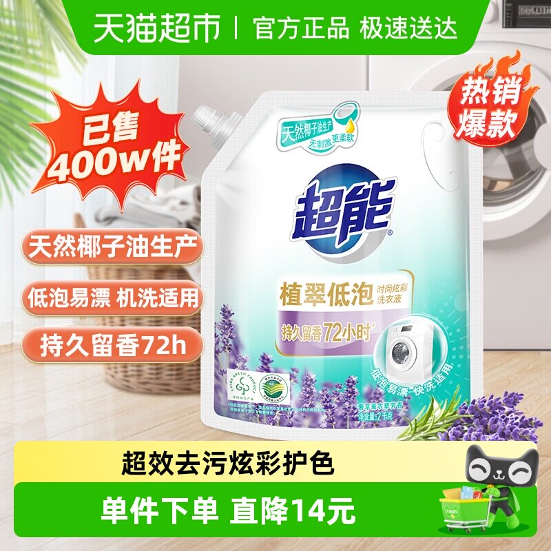 超能洗衣液时尚炫彩2kg袋装便携宿舍薰衣草香持久天然椰油不刺激