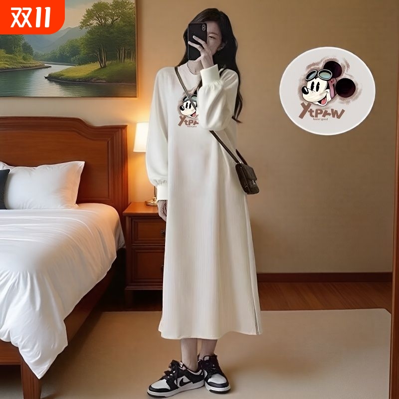 孕妇装秋冬季连衣裙2025新款大码圆领长袖T恤韩式过膝长纯棉裙子