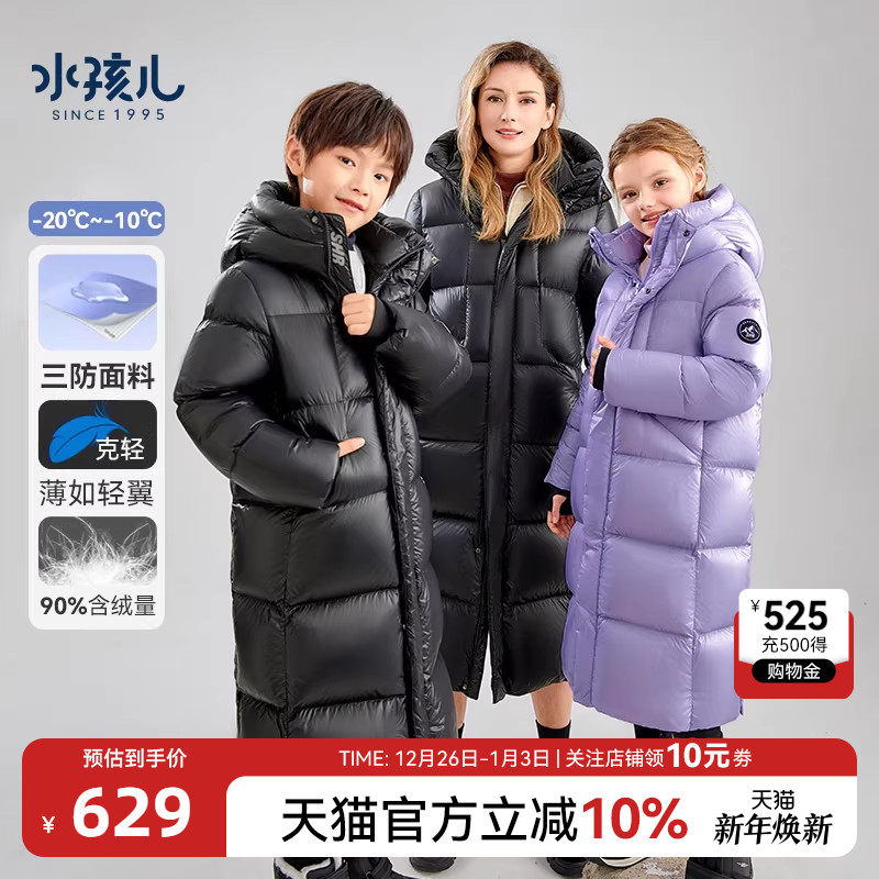 水孩儿儿童亲子装长款羽绒服男童加厚外套过膝纯色女童加长羽绒服