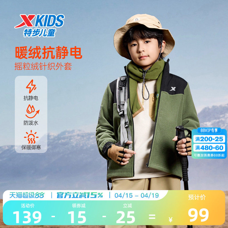 不来电|特步童装儿童春季男童摇粒绒拼色外套女童防静电保暖外套