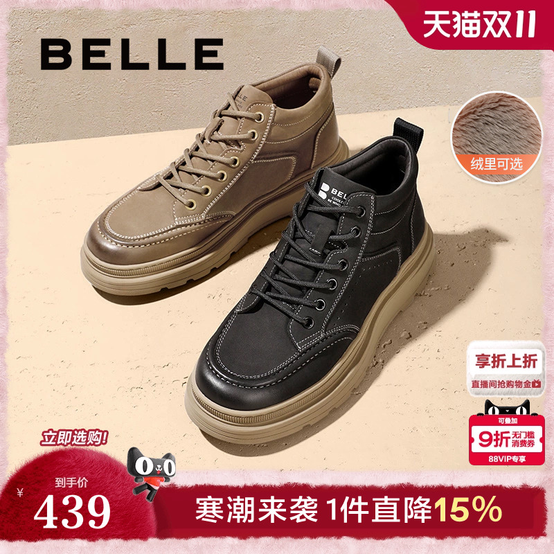 百丽男鞋加绒休闲鞋真牛皮厚底增高马丁靴高帮板鞋短靴子A1332DD3