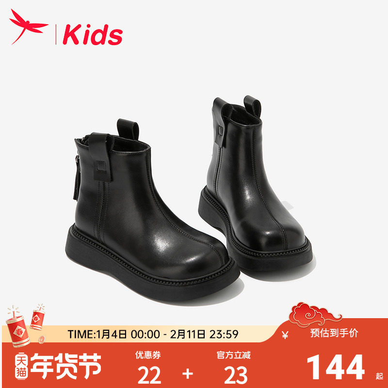 红蜻蜓女童鞋子儿童马丁小短靴子2025新款冬季加绒皮靴男童大童黑