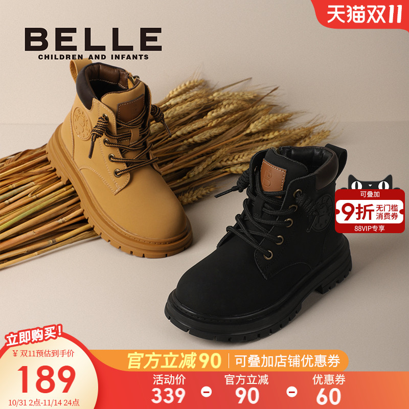 百丽童鞋男童马丁靴秋冬加绒保暖短靴女童时尚百搭大黄靴儿童靴子