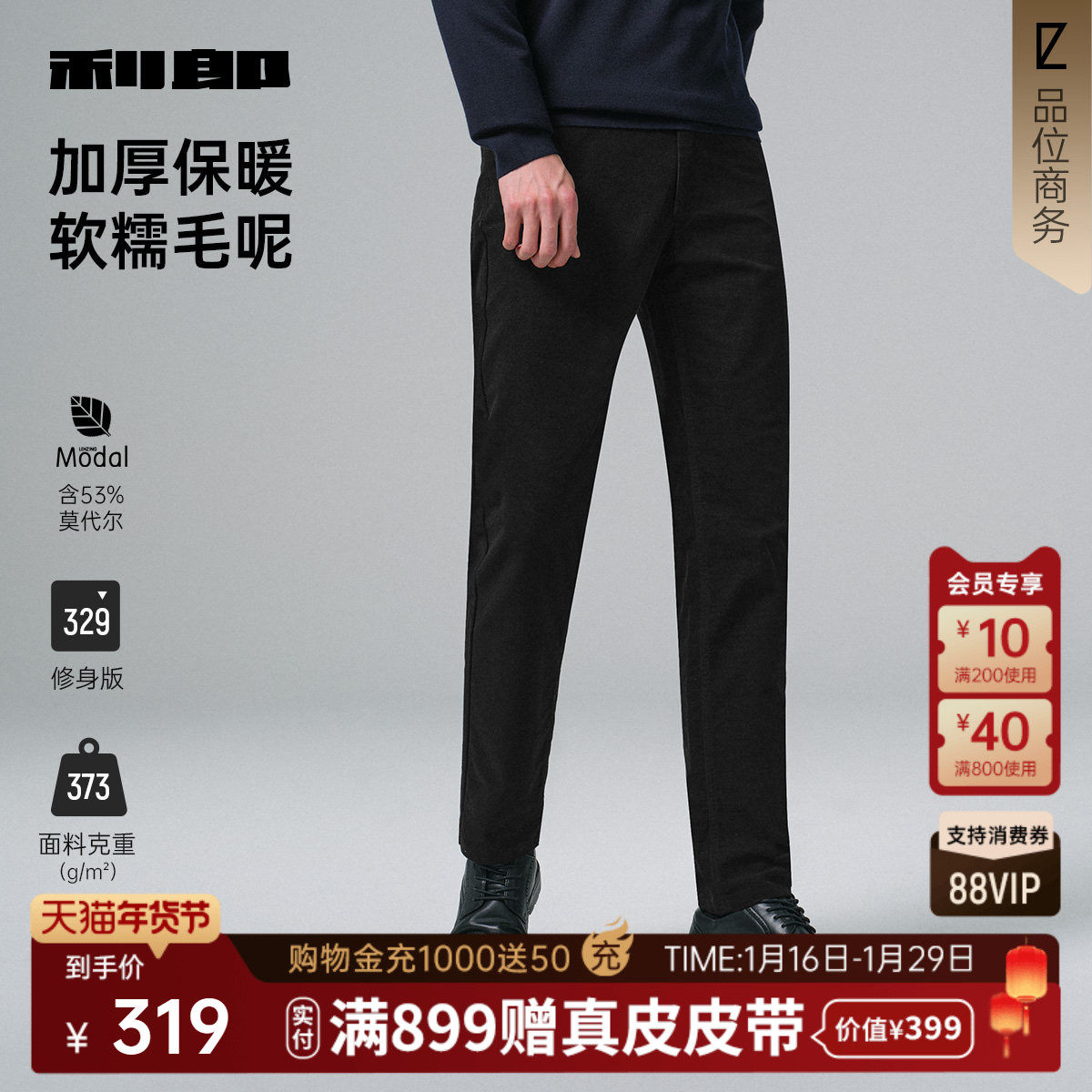 【加厚毛呢/弹力】利郎官方 休闲裤2025冬季商务黑色修身男装裤子