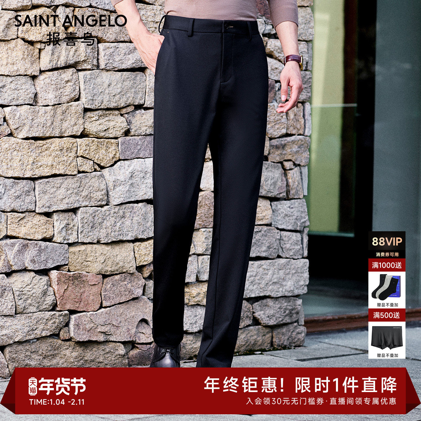 【光热保暖】报喜鸟秋冬新款男士商务休闲裤弹力舒适通勤黑色长裤