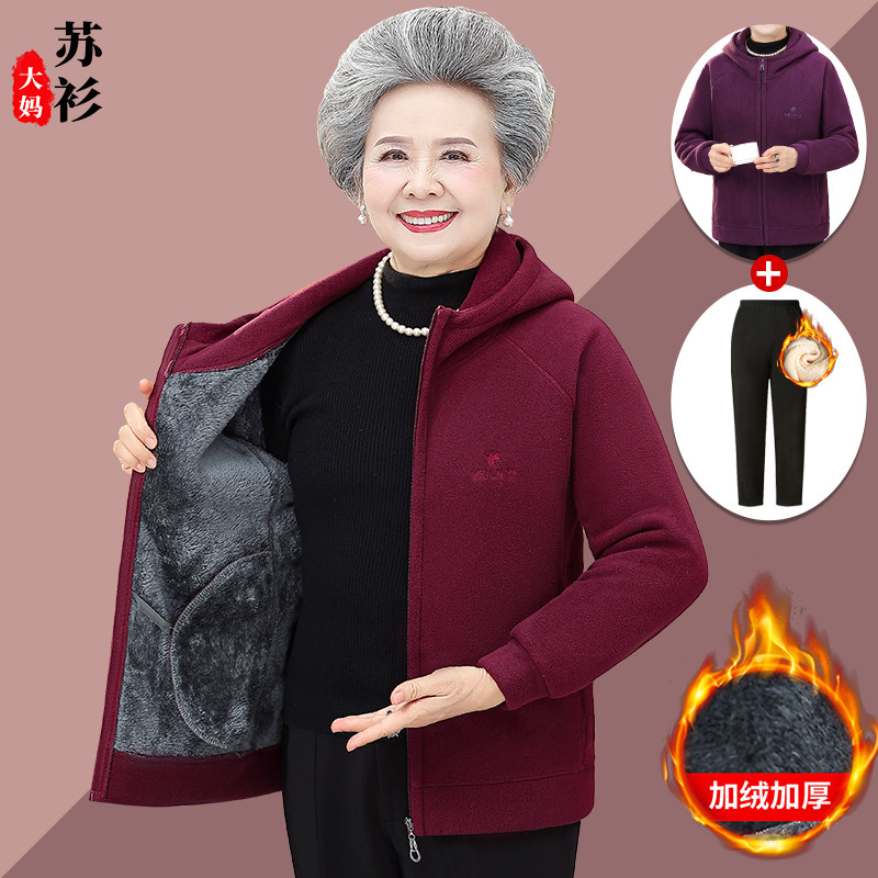 中老年人卫衣女妈妈冬装加绒外套奶奶秋冬抓绒衣服女装摇粒绒上衣