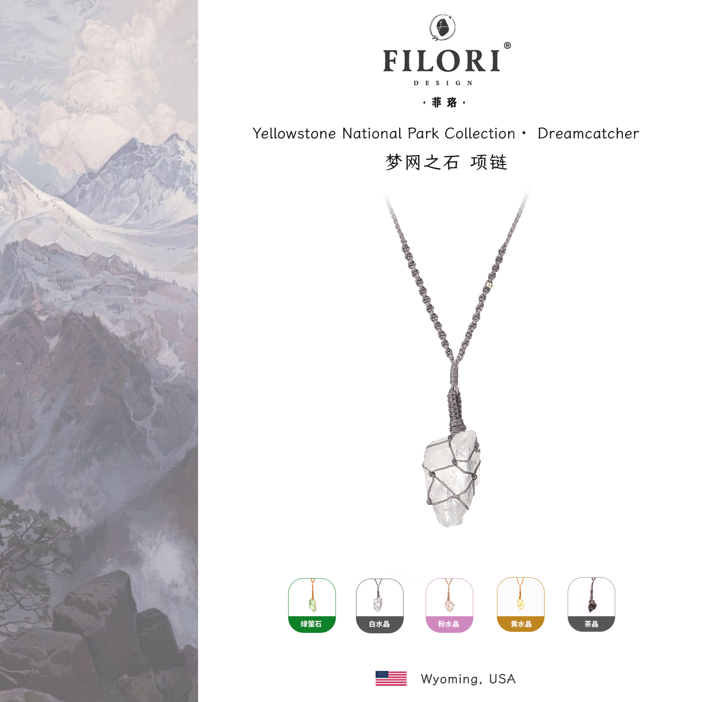 Filori菲珞天然水晶原石项链 女款不规则吊坠 可调节编织生日送礼