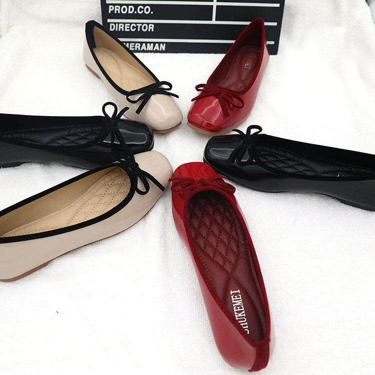 韩版女鞋新款漆皮蝴蝶结方头平底鞋休闲百搭浅口单鞋女飘鞋红鞋