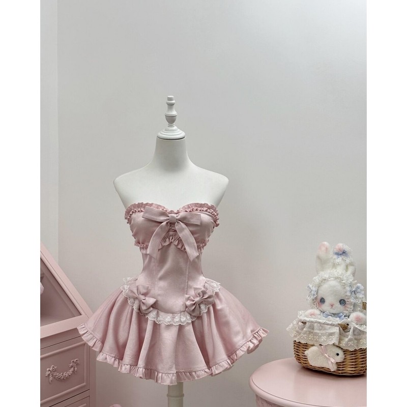 甜美可爱少女公主风抹胸连衣裙蕾丝蝴蝶结收腰显瘦减龄蓬蓬短裙子