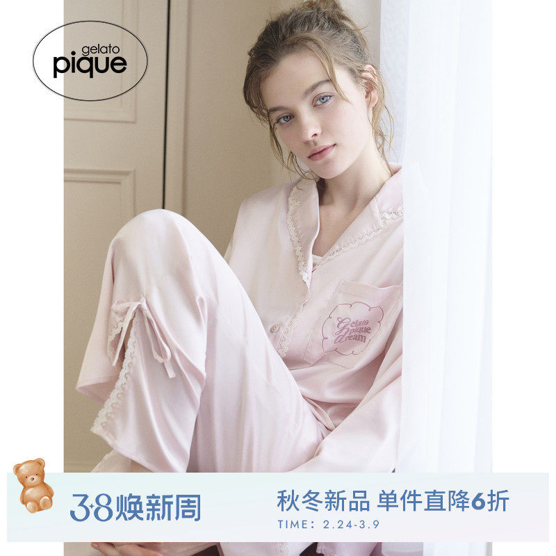 gelato pique25秋冬新品女睡衣缎面蕾丝长袖衬衫居家PWFT255264