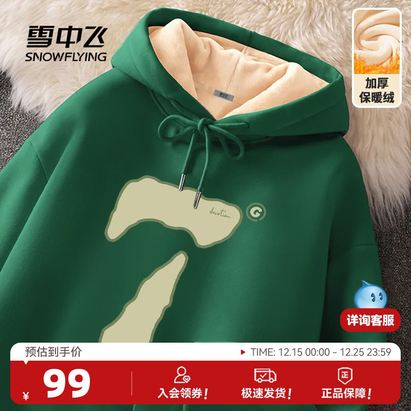 雪中飞连帽卫衣女加绒加厚春季2025新款墨绿色外套女生冬季穿搭PC