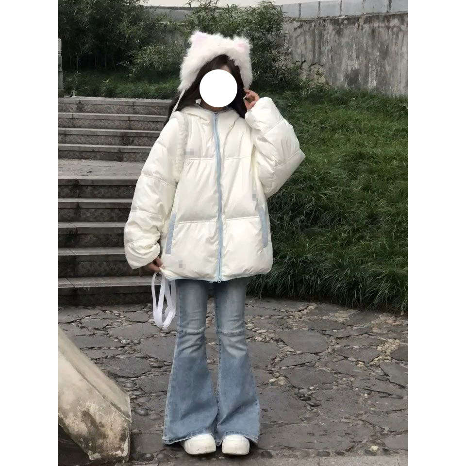韩系慵懒风蓝白撞色连帽棉服外套女生冬季新款百搭宽松保暖面包服