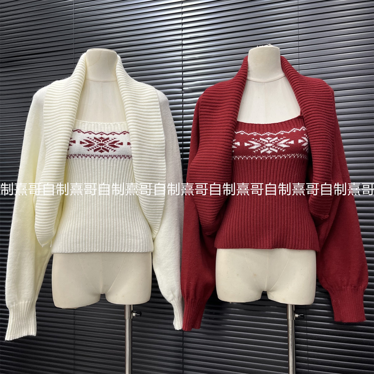 钩花坎肩毛衣外套女生冬季短款开衫上衣针织抹胸吊带背心两件套装