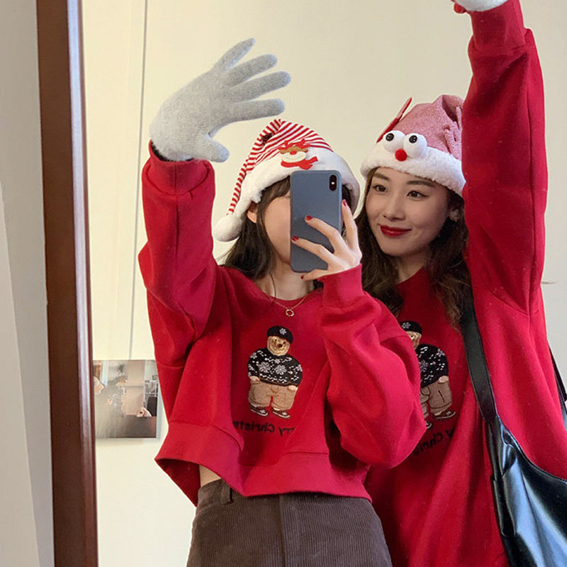 秋冬加绒圣诞节闺蜜装小熊刺绣卫衣外套女生短款圣诞红色圆领上衣