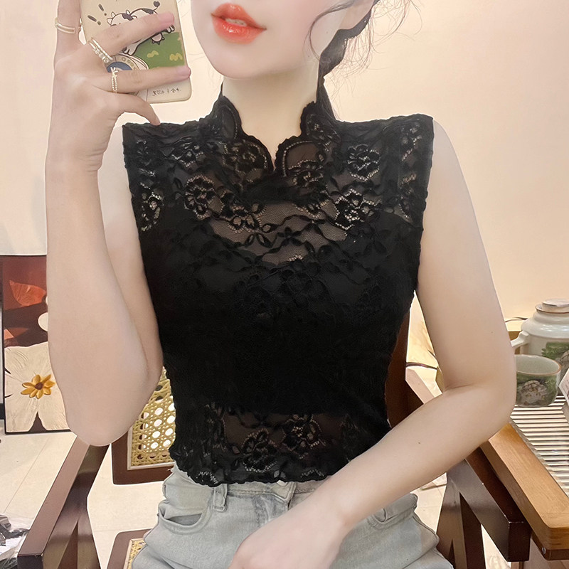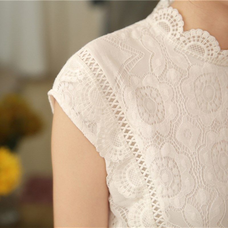 2024新款夏装雪纺衫女上衣无袖蕾丝衫女士短袖打底衫宽松白色小衫