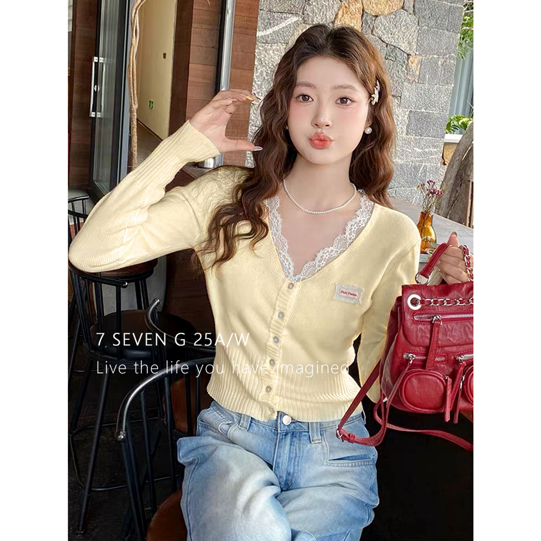 2025新款女士别致小衫蕾丝v领打底衫薄款气质设计感上衣白色花边