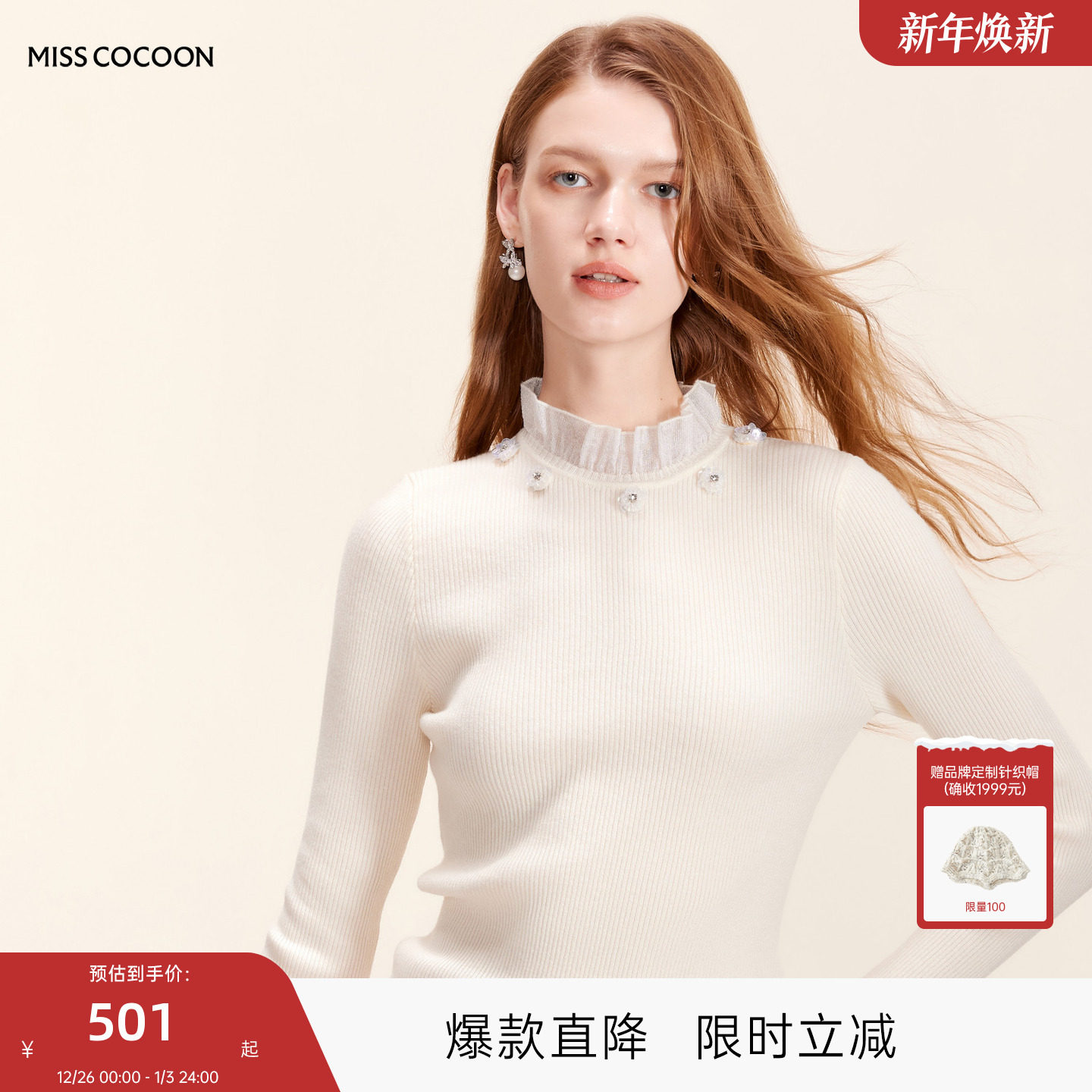 可可尼COCOON2025秋冬针织衫新款女士打底衫上衣法式白色蕾丝毛衣