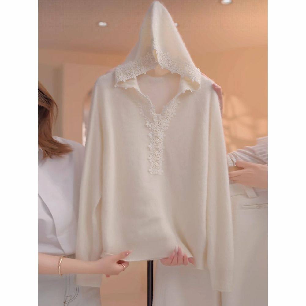 白色连帽毛衣女士秋冬慵懒风软糯宽松显瘦时尚蕾丝打底针织衫上衣