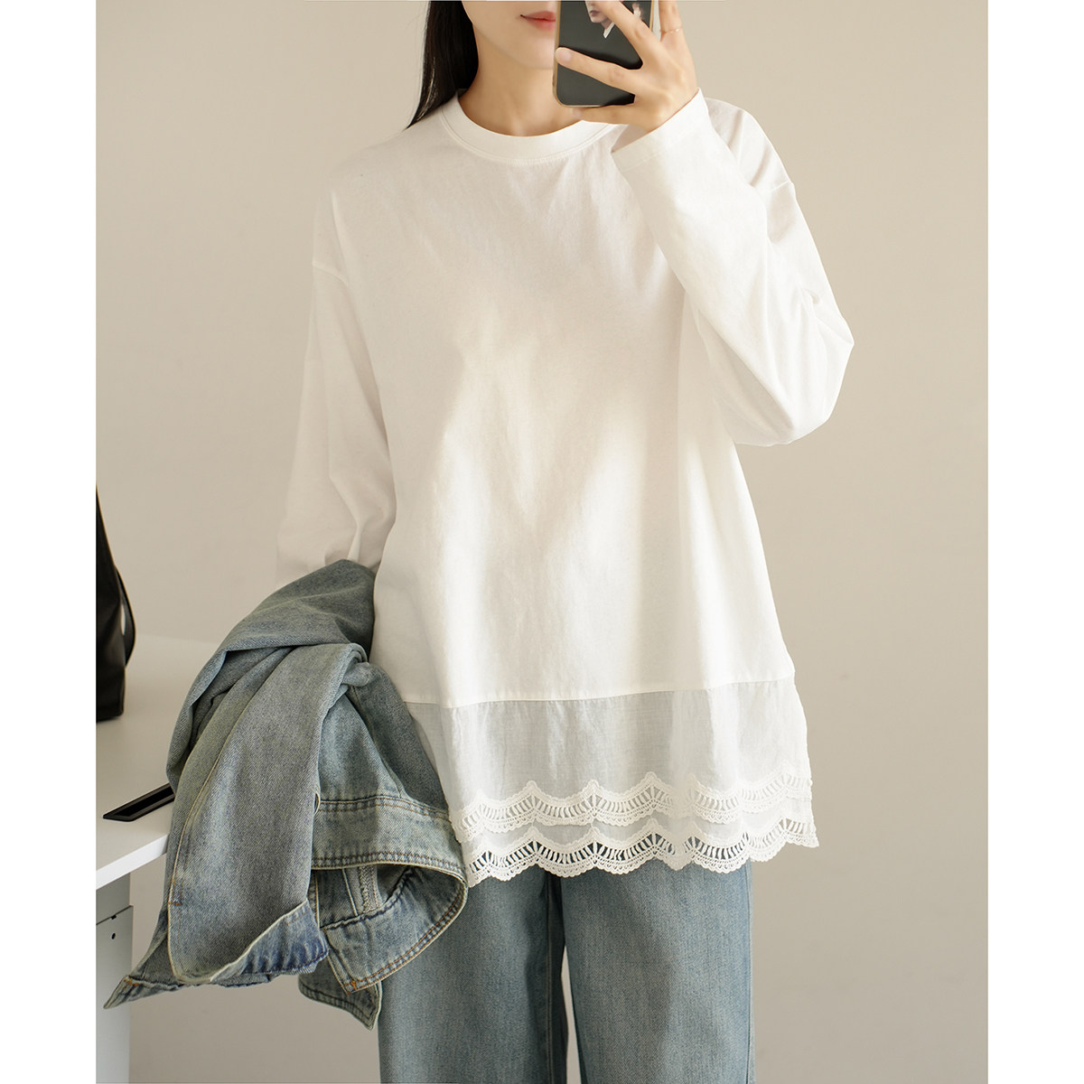 蕾丝花边T恤 内搭外穿 女士中长款宽松小白T 长袖打底衫 春款女装