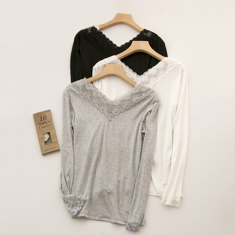 草本初色秋冬保暖女士一体式打底衫紧身亲肤薄款蕾丝修身上衣套装
