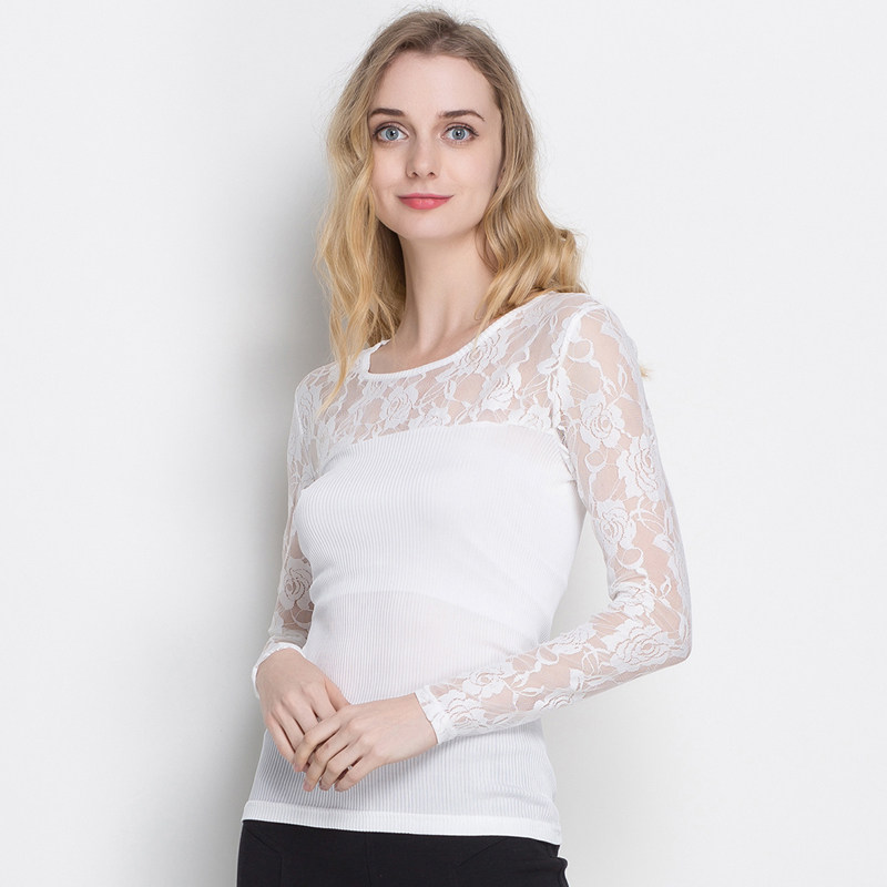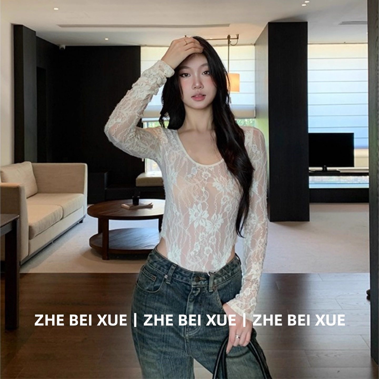性感辣妹白色蕾丝长袖t恤连体衣女士时尚纯欲气质修身内搭打底衫