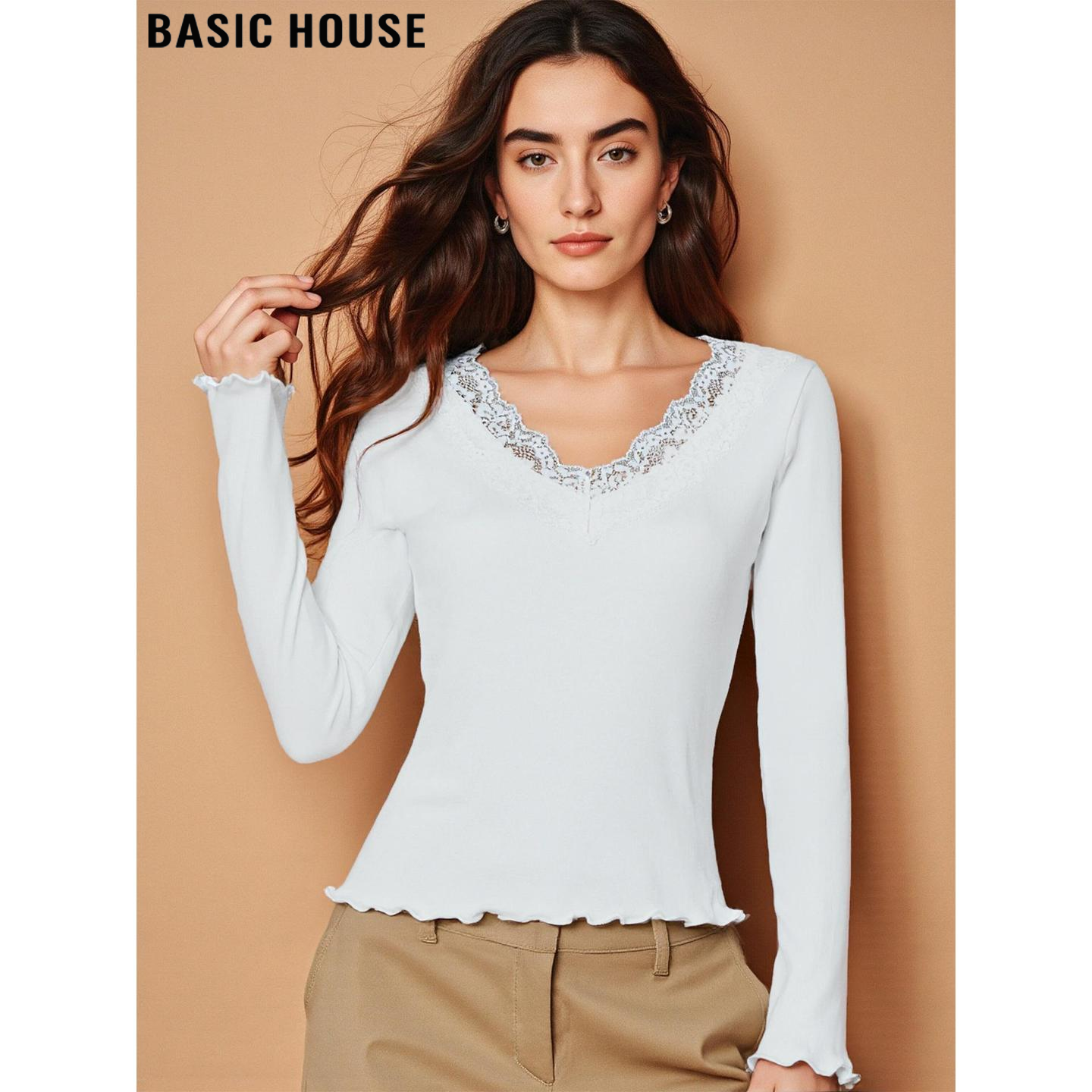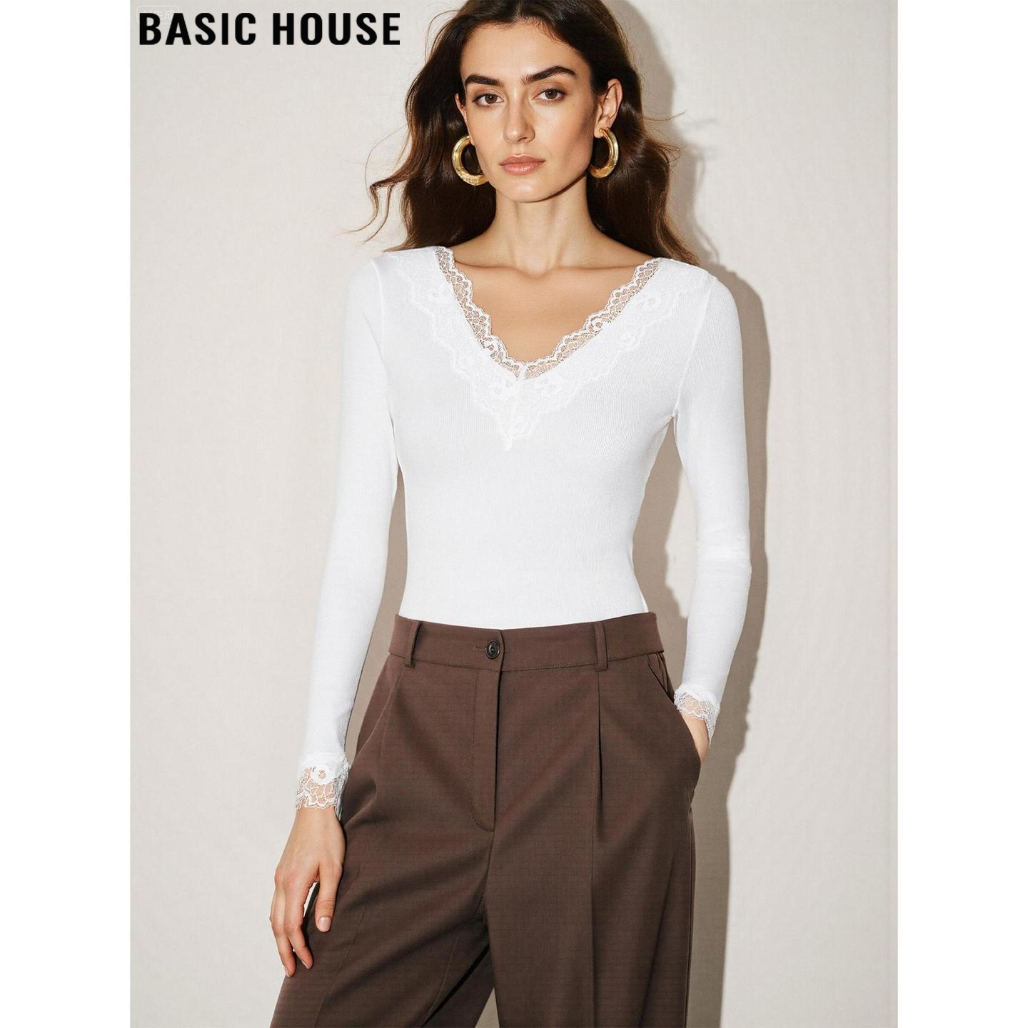 Basic House/百家好白色蕾丝花边V领打底衫女士冬季修身内搭上衣