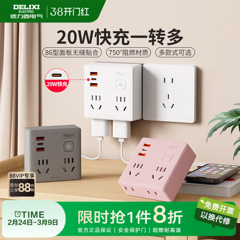 德力西多功能插座转换器86型一转多拓展插排T转换插头插座扩展USB