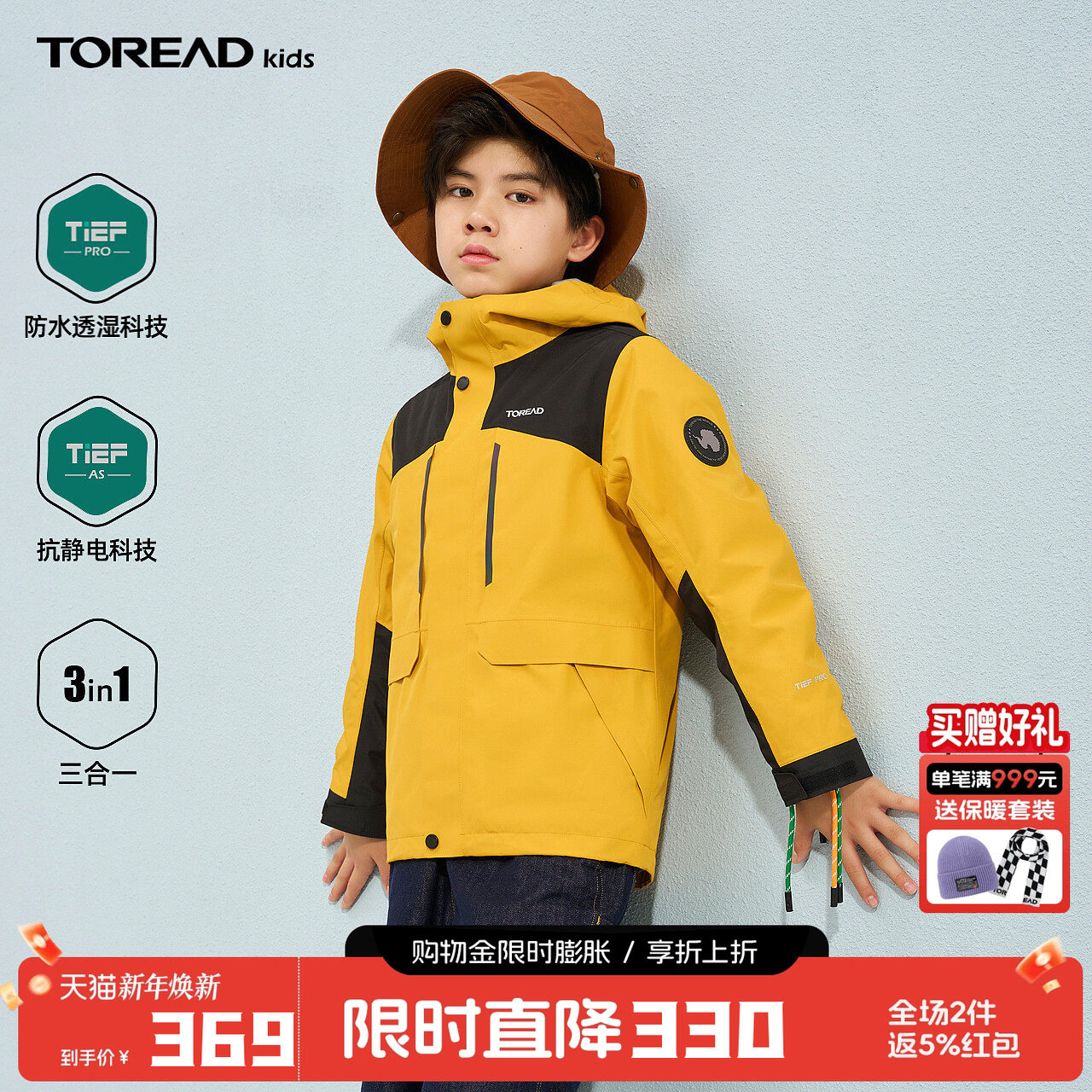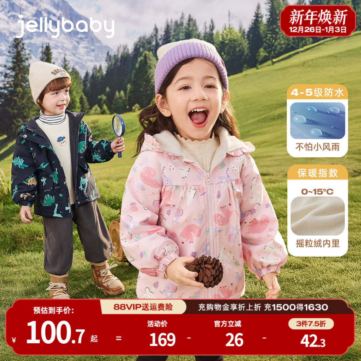 诺诗兰儿童冲锋夹克外衣三合一可拆卸男童大童春秋外出女童厚外套
