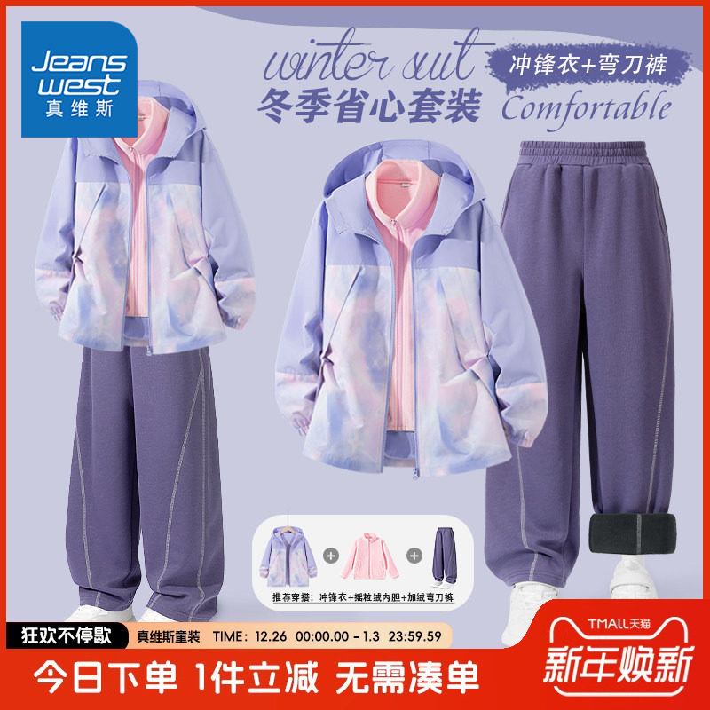 真维斯童装女童冬装套装儿童秋冬款户外防风冲锋衣女孩加绒弯刀裤