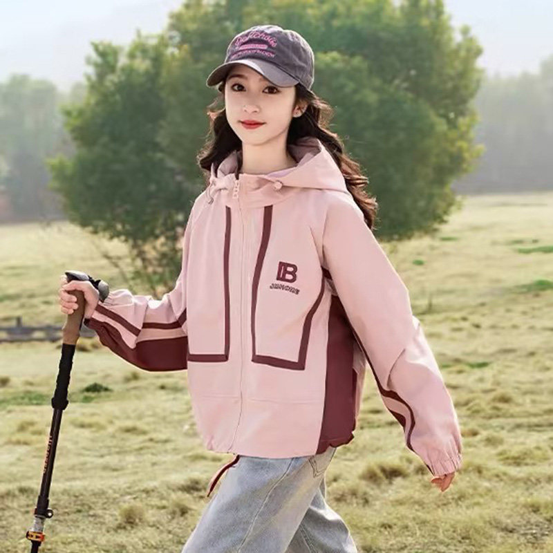 女童秋装冲锋衣洋气2025新款韩版中大童女孩工装连帽户外短款外套