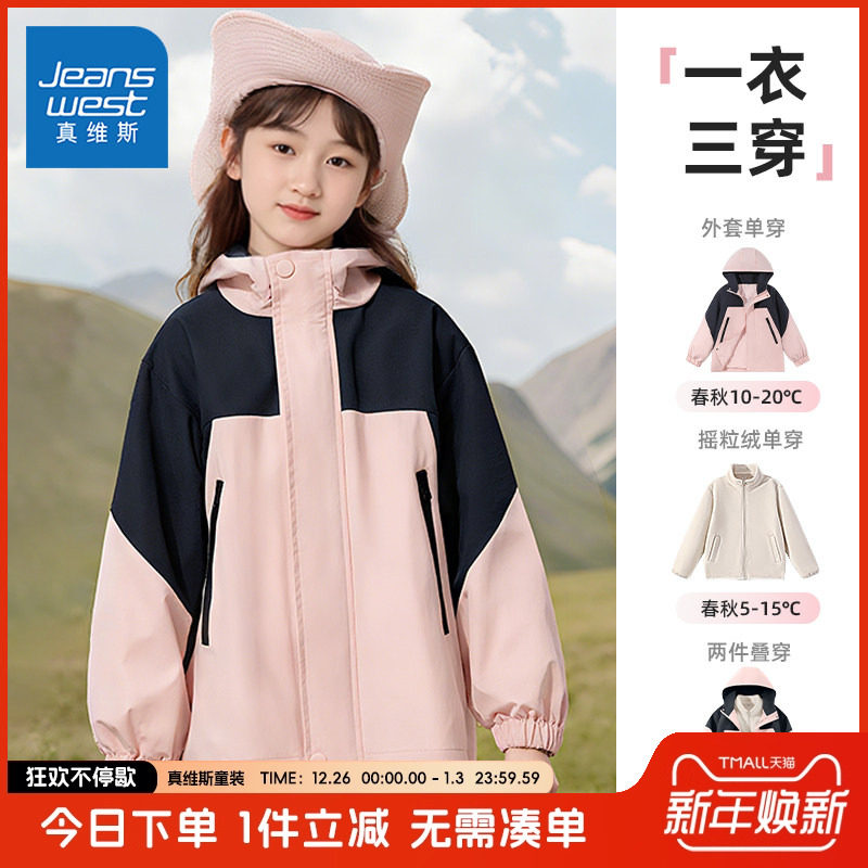 真维斯童装女童冲锋衣儿童秋冬款加绒防风夹克大童冬季三合一外套