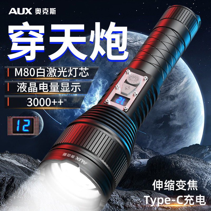奥克斯强光充电手电筒超亮户外远射白激光大功率超长续航氙气led