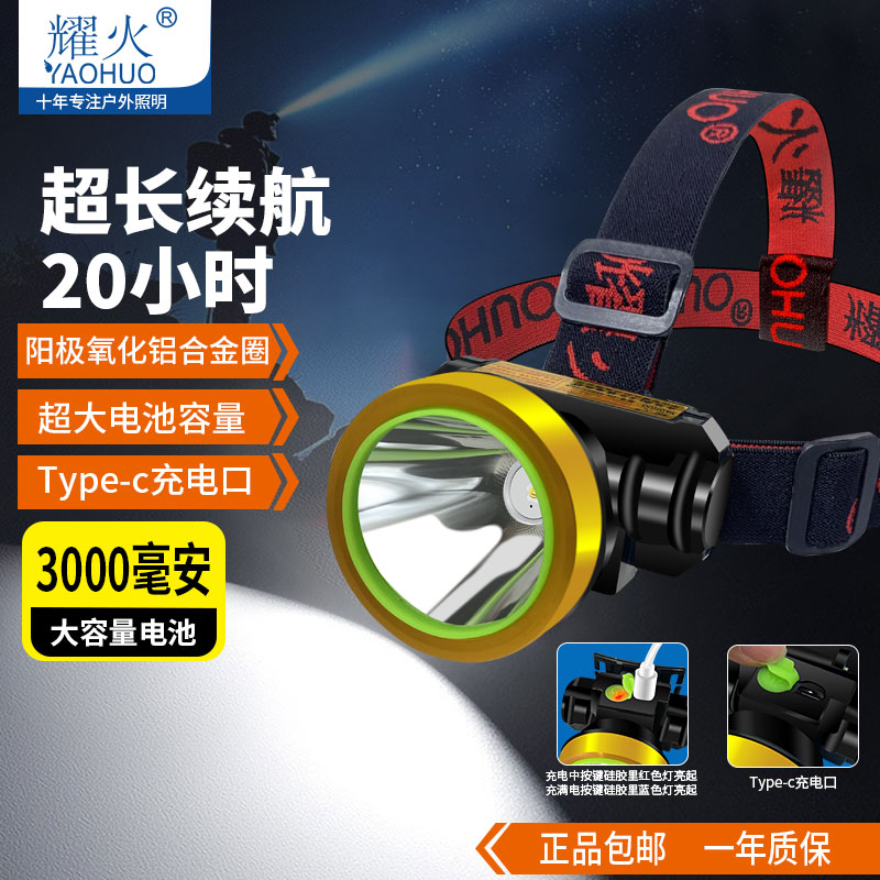 特价耀火LED头灯经典款超长续航强光20小时钓鱼灯 户外充电手电筒