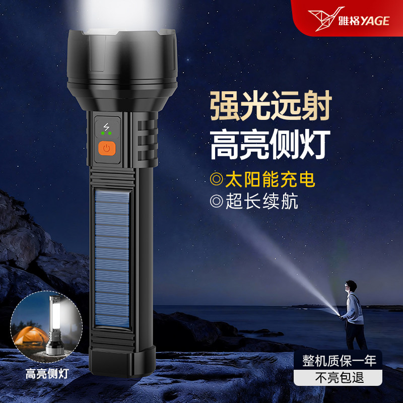 雅格LED充电手电筒强光照明防水高亮太阳能应急户外照明家用耐用