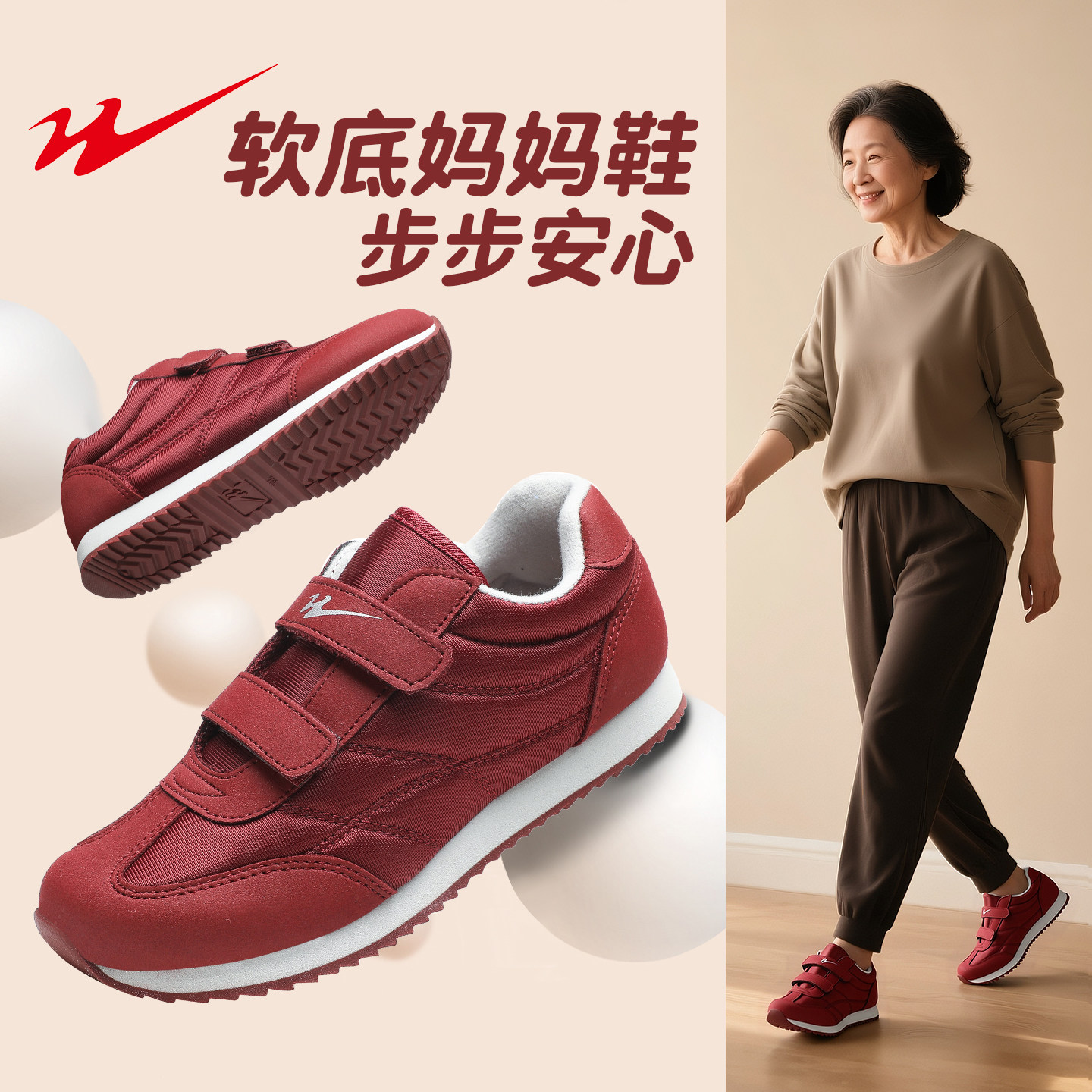 双星八特老人鞋女新款春秋中老年轻便运动鞋红色女鞋大码妈妈鞋子
